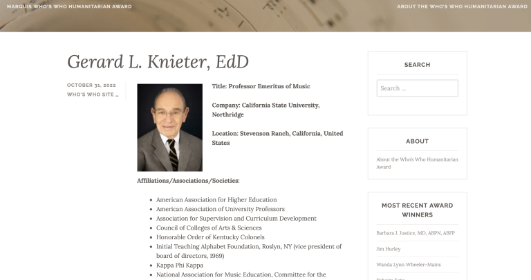 Who’s Who in American Education – 1994-1995, 4th Edition (pub. 1993); Who’s Who in Entertainment – 1998-1999, 3rd Edition (pub. 1997);